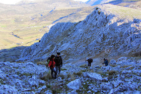 La bajada de este tajo, en vez de hacerla en dirección al collado de subida, la hicimos por un canal que empieza casi en la cima y que va en dirección oeste. Al principio se baja bien pero en la mitad de la bajada hay un cortado complicado de pasar y que, tras estudiarlo desde distintas zonas, localizamos un paso que nos permitía bajar sin grandes riesgos. Después de este paso, el resto de la bajada es mas fácil. El descenso es de 300 m de desnivel con mucha pendiente.